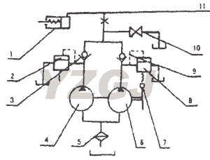 9-低壓?jiǎn)蜗蜷y 10-卸荷閥 11-高壓膠管